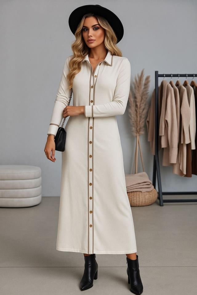 İthal Kaşkorse Kumaş şerit Ve Düğme Detaylı Elbise