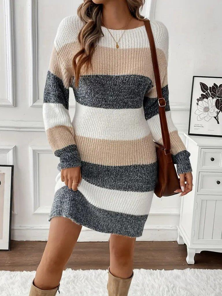 Kadın Uzun Kollu Yuvarlak Yaka çizgili çok Renkli Triko Elbise