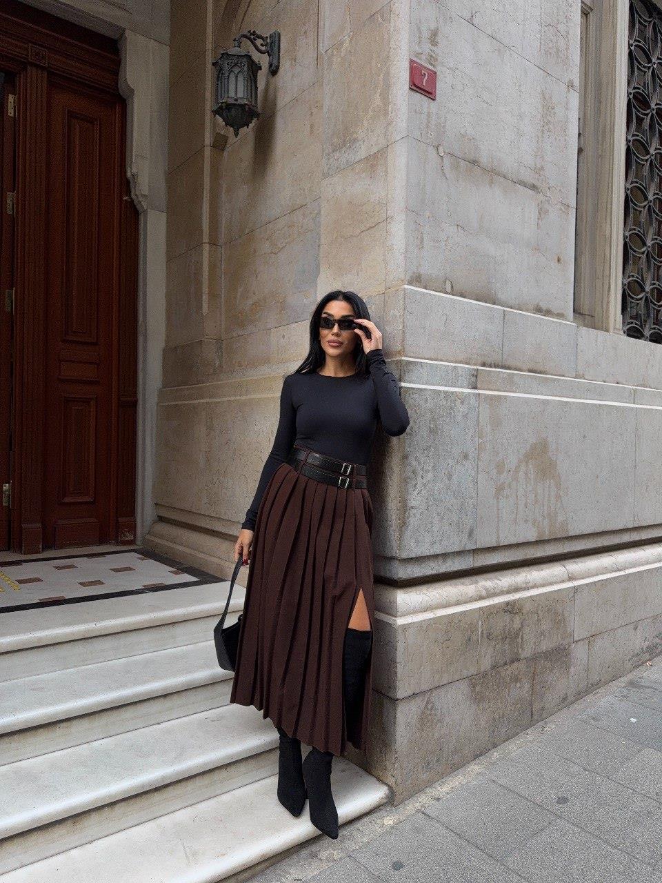 Zr Model Çift Kemer Detaylı ve Yırtmaçlı Pileli Etek- Kahve