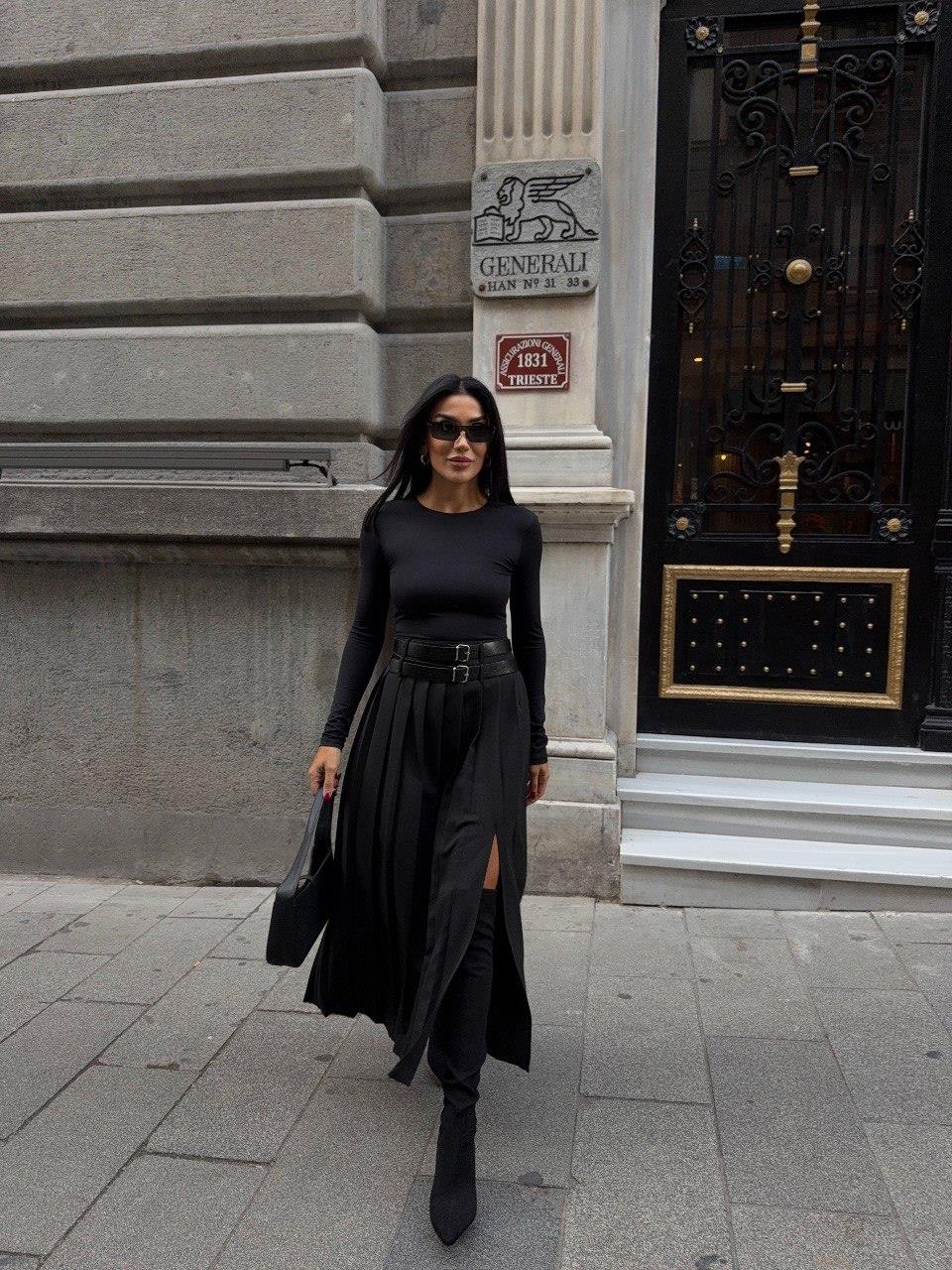 Zr Model Çift Kemer Detaylı ve Yırtmaçlı Pileli Etek- Siyah