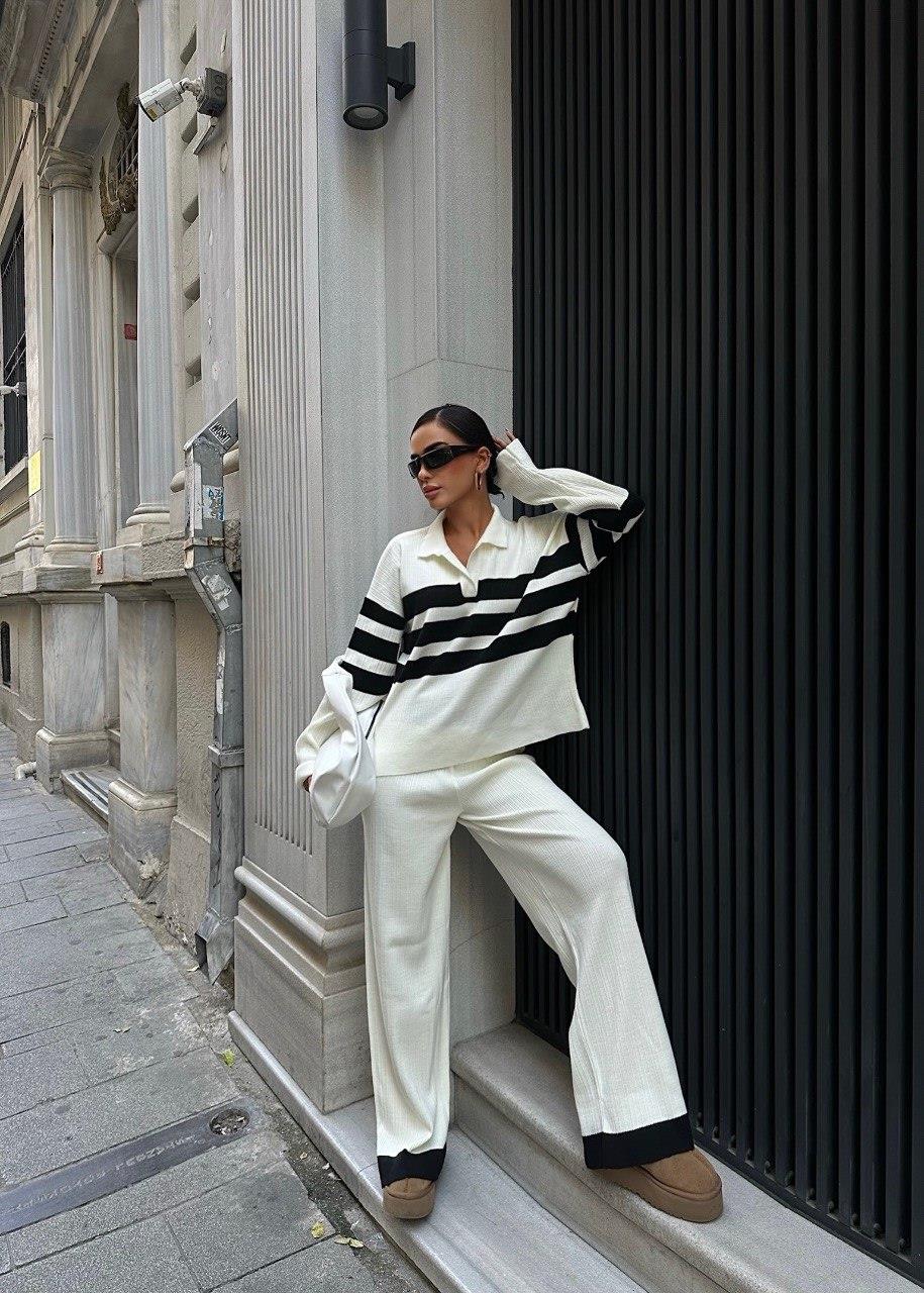 Zr Model Çizgili Premium Triko Takım - Beyaz