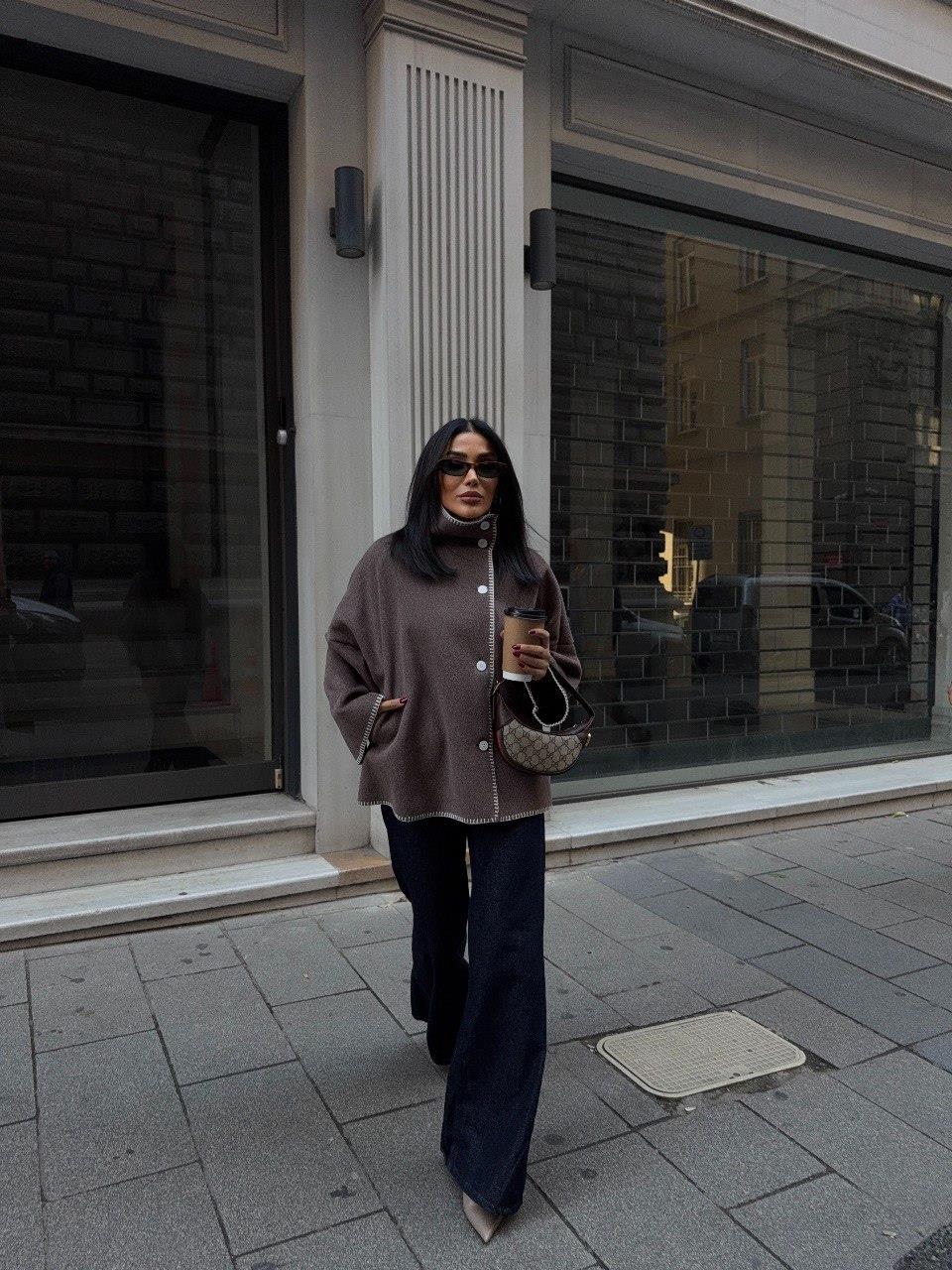 Zr Model Dikiş Detay Dik Yaka Premium Kaşe Ceket - Kahverengi