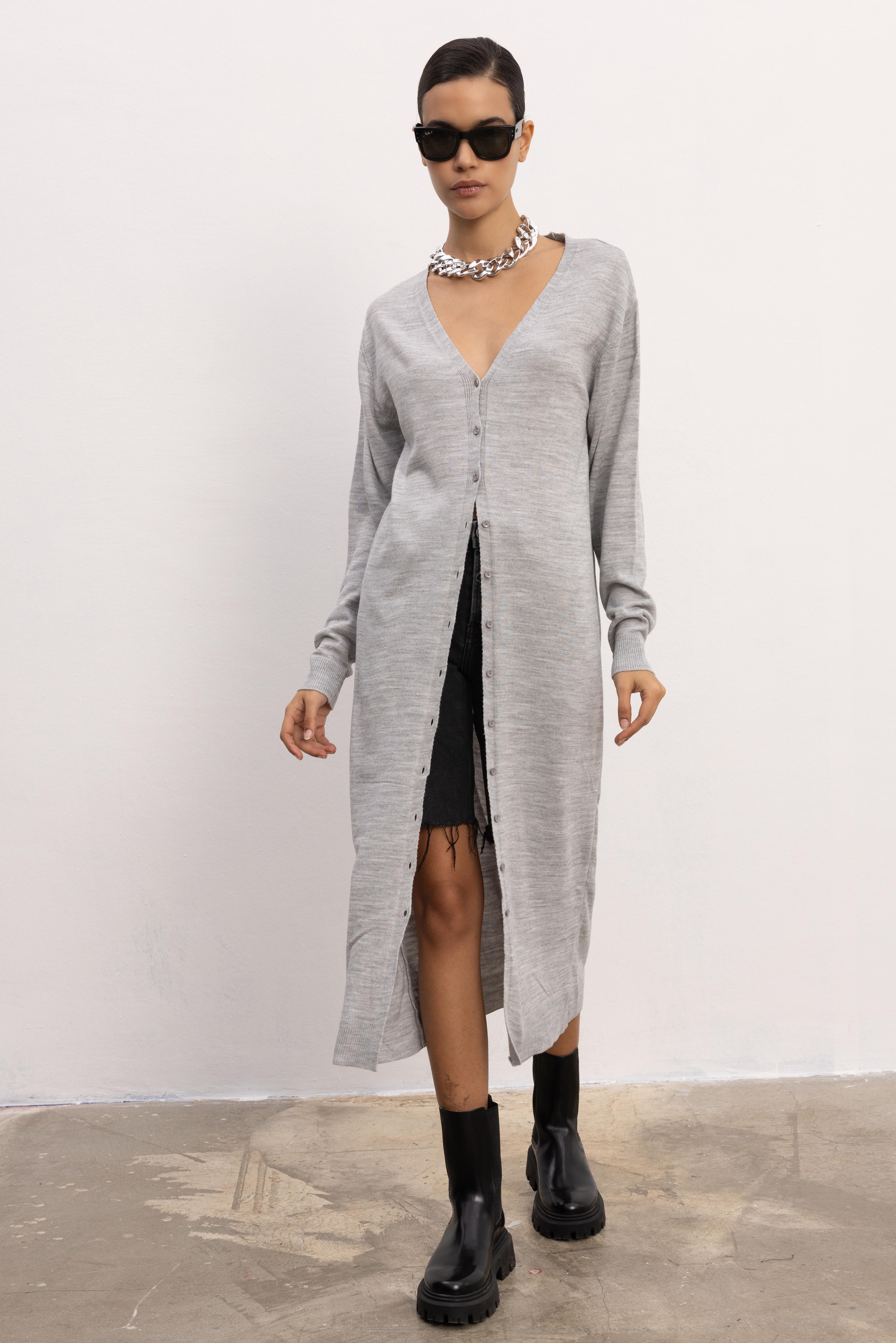 Düğmeli uzun triko hırka - GRİ