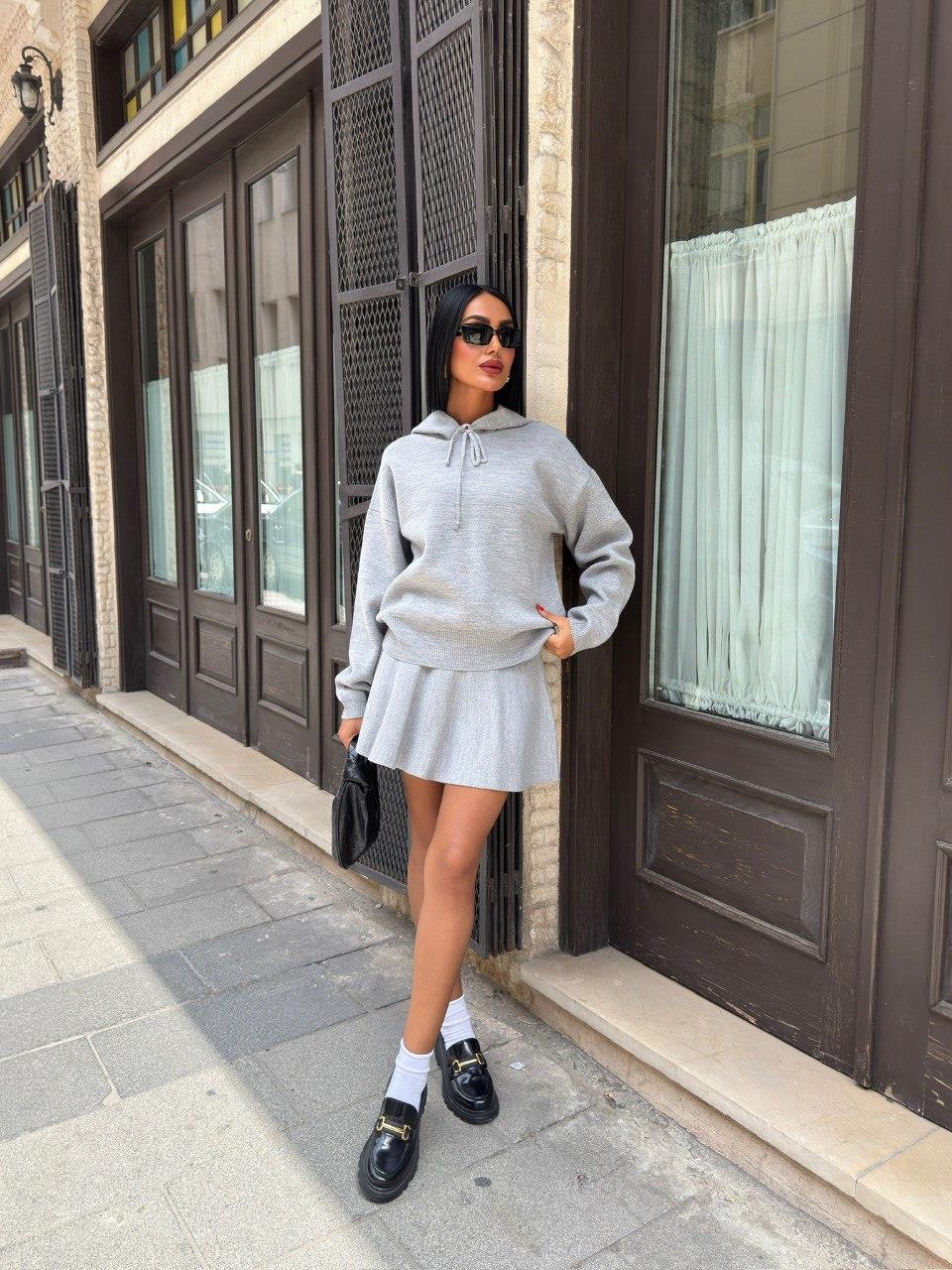Zr Model Kapüşonlu Etekli Premium Triko Takım - Gri (S4K10224 - Gri)
