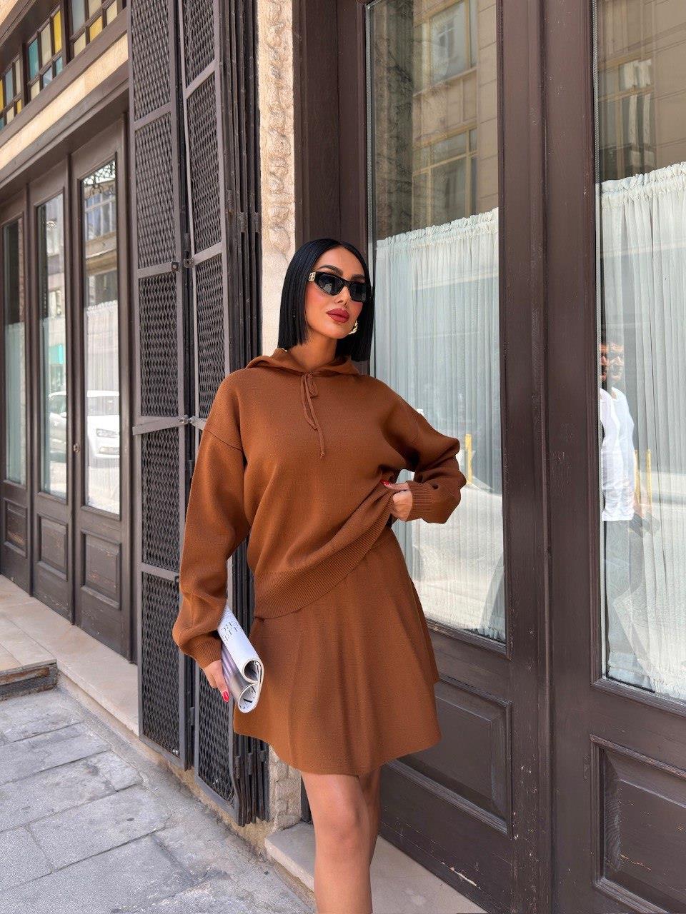 Zr Model Kapüşonlu Etekli Premium Triko Takım - Kahve (S4K10224 - Kahve)