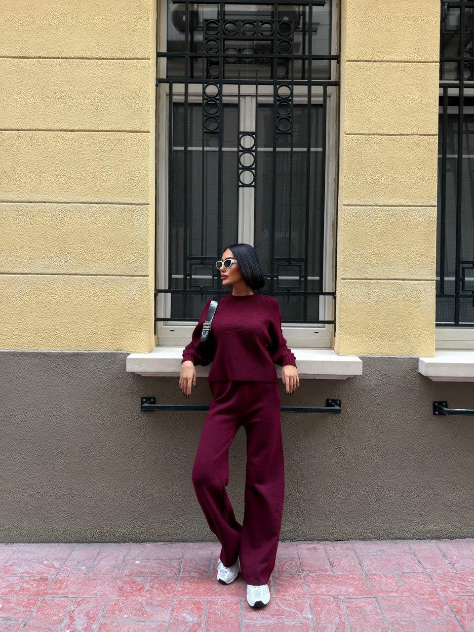 Zr Model Kolları Aksesuar Dekolteli Triko Takım - Bordo (S4K10229 - Bordo)