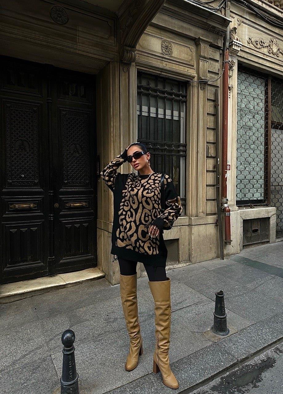 Zr Model Leopar Desen Yırtık Detay Triko - Siyah