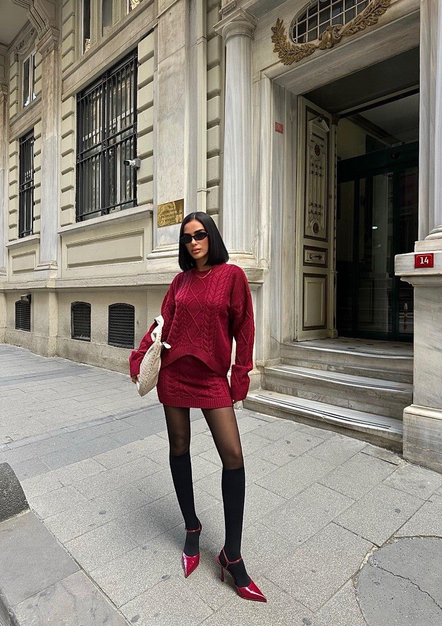 Zr Model Örgü Desen Etekli Triko Takım - Bordo (S4K9990 - Bordo)