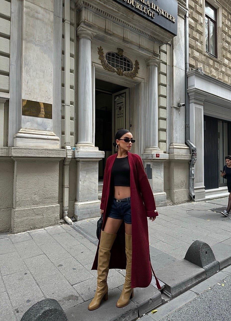 Zr model premium kalite kuşaklı uzun hırka - BORDO