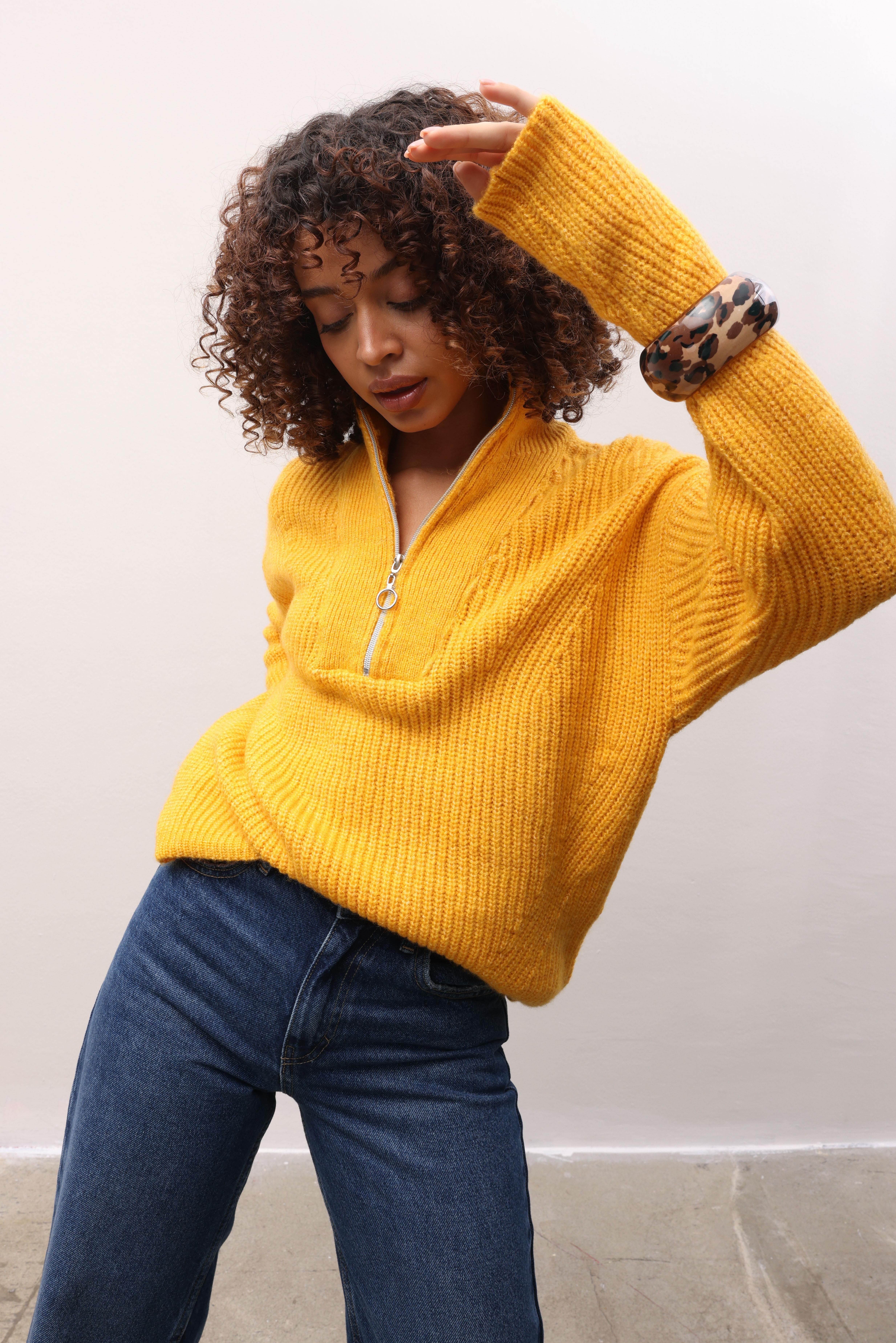 Zr Model Yaka Fermuar Örgü Yumoş Triko - Sarı (S3K1236 - Sarı)